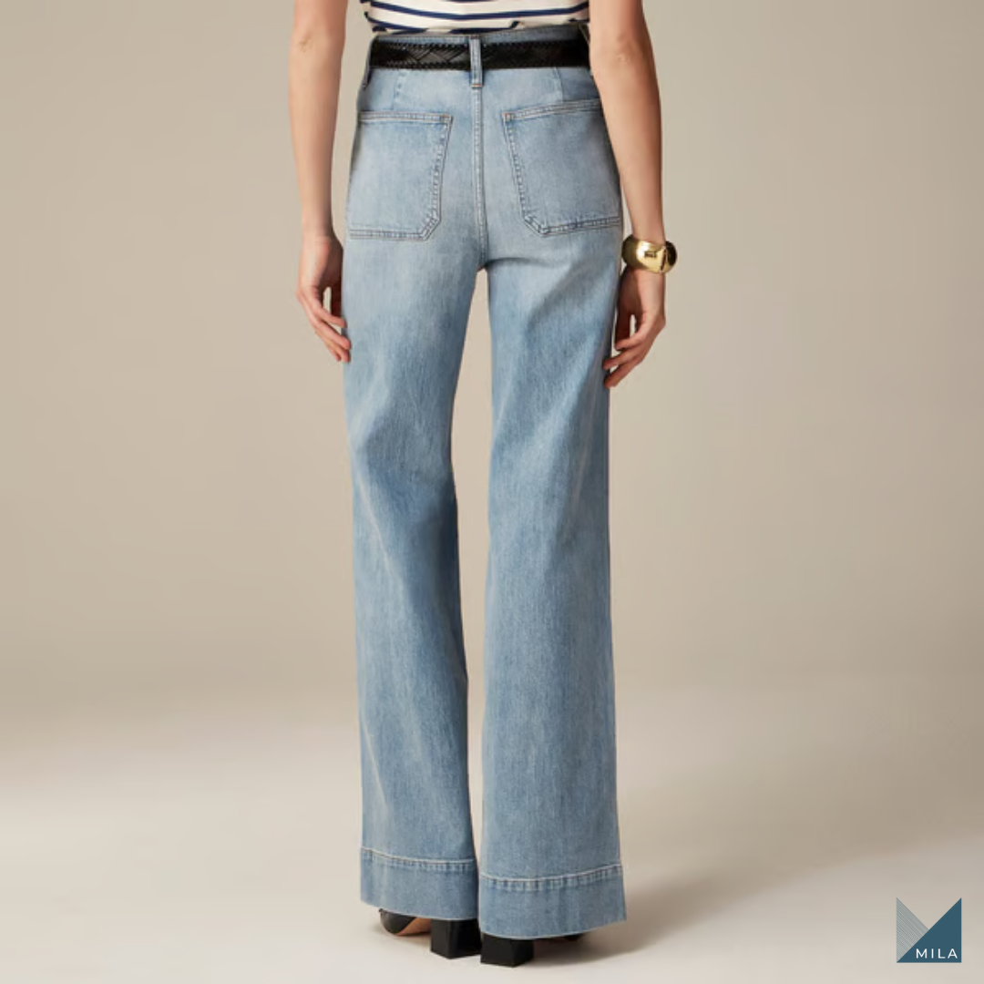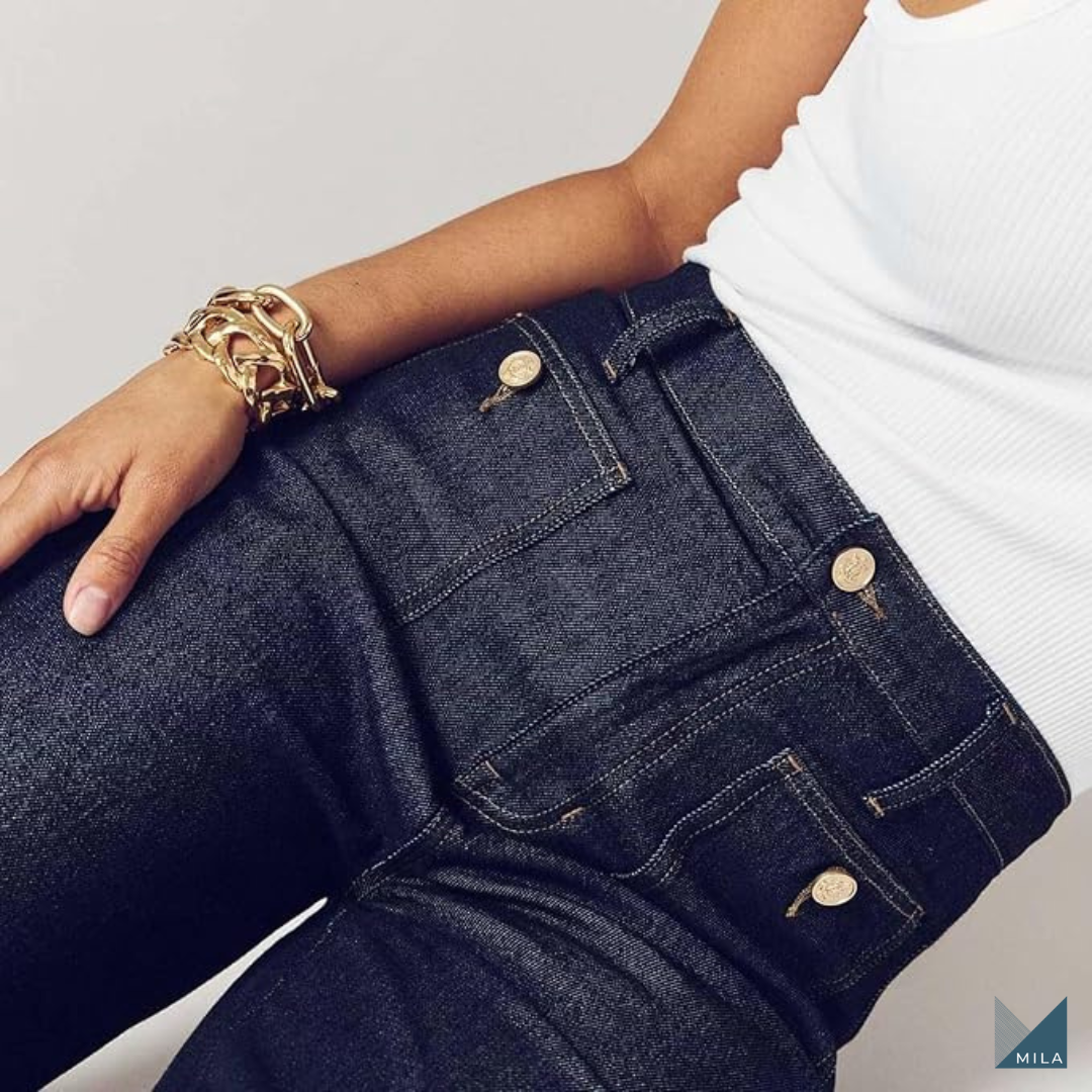 Descubre la comodidad de los pantalones vaqueros Mila, que con su cintura alta y ajuste elástico, se adaptan a tu cuerpo, permitiéndote moverte con libertad todo el día.
